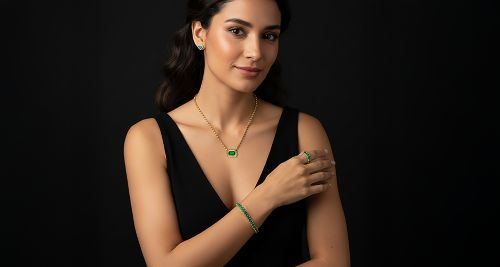 14KT Yellow Gold Diamond and Emerald Baguette Necklace - 17 x 20 mm / Emerald / 14KT / Yellow